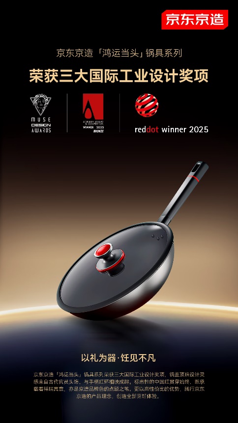 近日,京东自有品牌京东京造推出的“鸿运当头”锅具系列先后获得2025年缪斯国际设计奖(MUSE Design Awards)、德国红点奖(Red Dot Design Award)及意大利A’设计大奖(A’ Design Award)三项国际工业设计奖项。