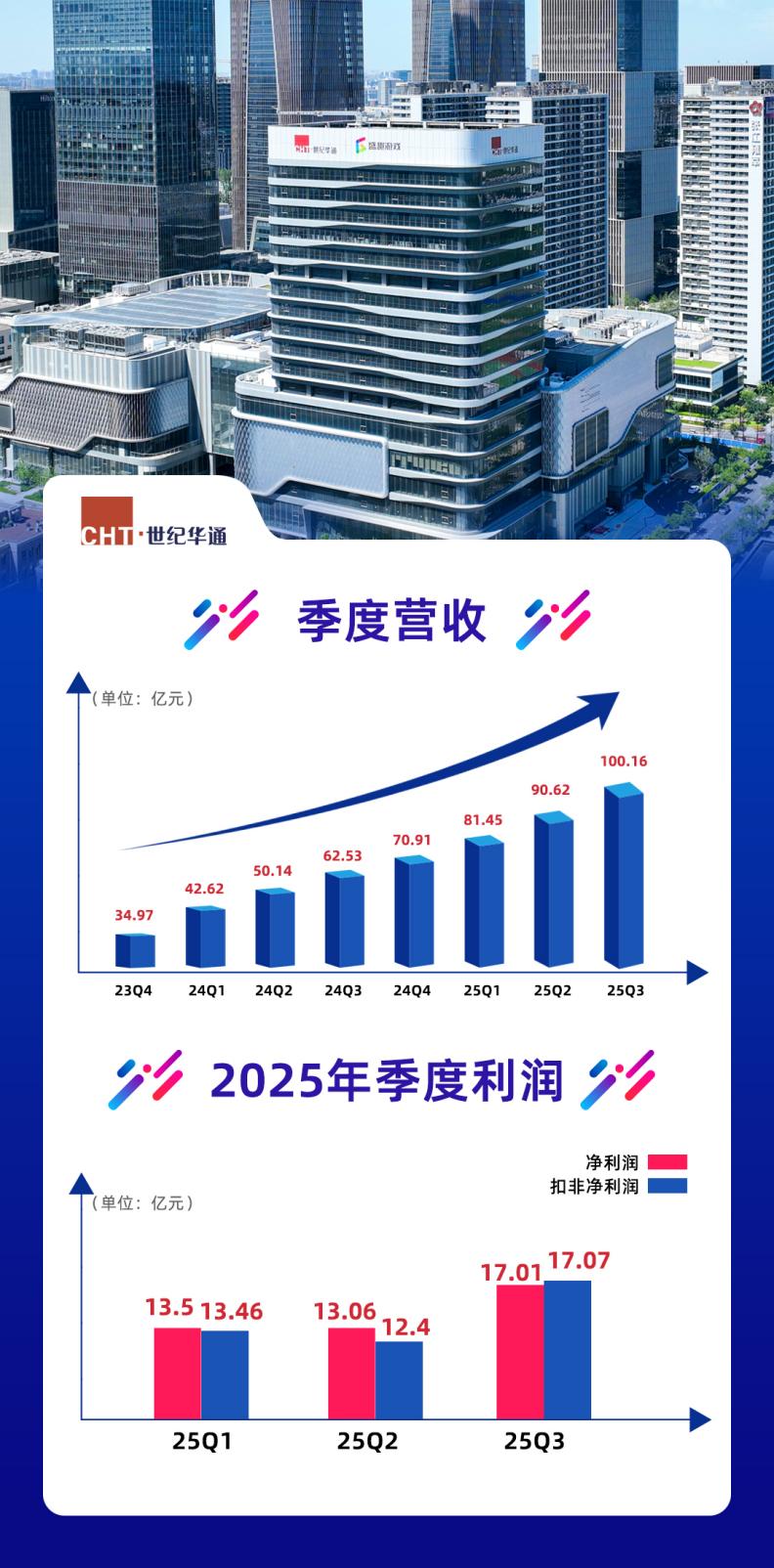 世纪华通(002602.sz)实现营收100.16亿元,同比增长60.19%;净利润17.01亿元,同比增长163.78%;扣非后净利润17.07亿元,同比增长171.27%——上述成绩单来自10月30日公司披露的2025第三季度报告。至此,世纪华通不仅达成了季度营收“十连升”,单季度营收更是第一次突破百亿规模,展示出可持续的强劲增长态势。