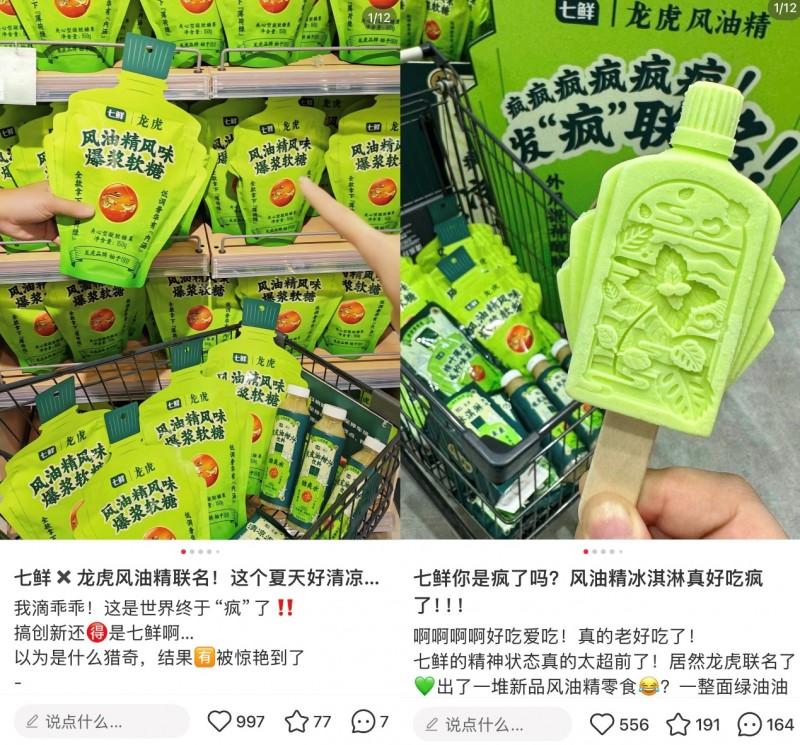 获得主题系列奖的龙虎与鹤年堂两个联名系列,均是最佳例证。七鲜与老字号龙虎合作推出的风油精软糖,巧妙嫁接“发疯文学”社交热点,不仅登上夏季热搜榜,更连续多月稳居七鲜糖糖果类目销量榜首;与老字号鹤年堂联名的花椒味五黑山药片、艾草丹参肩颈热敷围脖等,则精准捕捉了年轻人“带薪养生”的新需求,将传统养生智慧融入现代便捷商品。这些产品在保留老字号配方底蕴的同时,通过形态创新与社交基因植入,成功打破了次元壁,实现了从线下货柜到线上社交媒体的全域引爆。