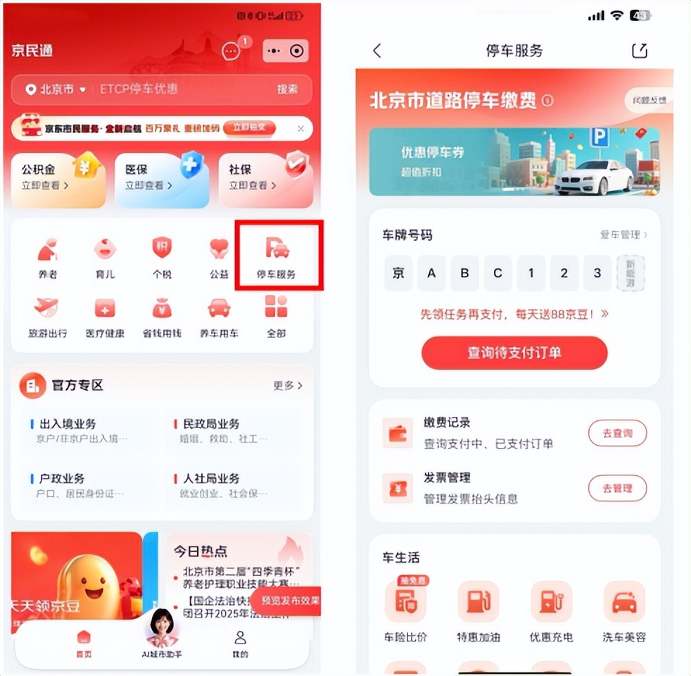 值得一提的是,部分城市还推出了极具本地特色的便民功能。在北京,市民可通过京东App市民服务直接使用“北京市道路停车缴费”功能——登录京东App,搜索“京民通”,进入小程序后点击“停车服务”,即可完成路边停车费用的在线缴纳,进一步拓展城市智慧出行场景。