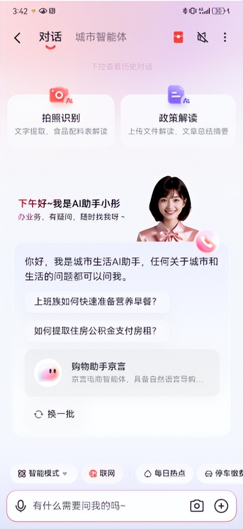 为进一步提升用户体验,京东App上线的市民服务创新引入AI智能助手“AI助手小彤”,通过AI驱动服务升级,显著提升办事效率、降低操作门槛。该AI智能助手基于京东全自研的JoyAI大模型,具备强大的自然语言理解与生成能力,能够以拟人化、场景化的方式精准解答用户各类疑问,并根据用户需求智能推荐匹配的服务路径。