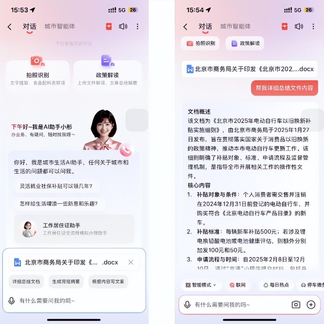 · 政策解读:用户上传政府公告、办事指南等图片或文档,“AI助手小彤”可一键生成通俗易懂的政策解读、要点摘要和办理建议,大幅降低公众理解门槛。