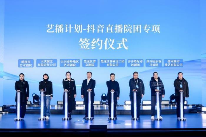 活动现场,黑龙江省京剧院等8家黑龙江国有文艺院团签约加入“艺播计划·抖音直播院团专项”。抖音直播院团专项负责人介绍,抖音将从直播体系搭建、艺术家支持、资源投入、舞台打造等四个方面为院团提供支持,成为院团“数字化合伙人”,为院团提供“一院一策”支持,针对青年演员启动“新星推广计划”,并给予单院团全年最高60万元现金保底收入、院团名家全年最高14万元创作补贴。
