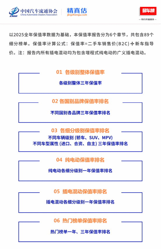 在此行业背景下,中国汽车流通协会与精真估即将联合发布2025年度中国汽车保值率报告(后简称“报告”),腾易科技旗下易车榜凭借强劲的行业影响力与传播力,成为本次报告的特约传播媒体。作为报告数据体系的重要组成部分,易车榜提供专业数据参考的同时,也让权威行业数据通过多元渠道触达更广泛受众。