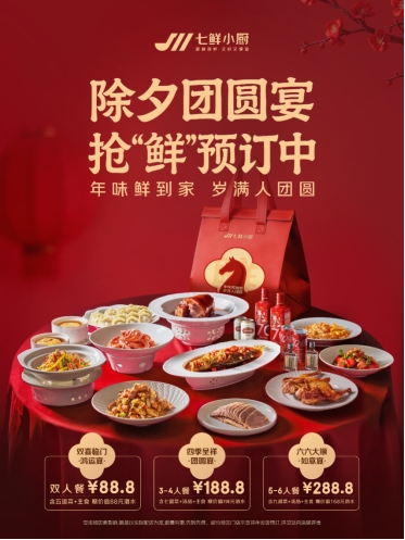 七鲜小厨首次推出年夜饭套餐,2月2日起开始预订,订餐最高送168元好酒