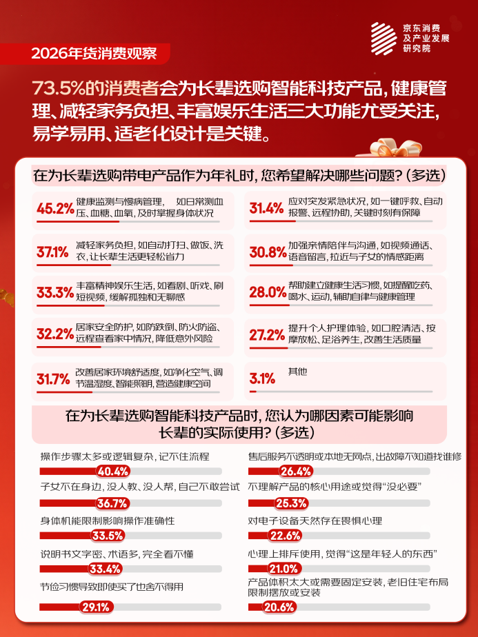计划为长辈选购智能家电数码或健康设备的消费者,主要期望实现健康监测(45.2%)、帮助长辈减轻家务(37.1%)及丰富精神娱乐生活(33.3%)功能。在选购此类年礼时,大家也有一些较为集中的痛点:操作复杂性与指导缺失是首要障碍,40.4%消费者明确表示担心“操作步骤太多或逻辑复杂”,36.7%忧虑“子女不在身边无人教学”。此外,适老化设计不足、安装痛点突出也是主要顾虑。由此可见,好的智能技术产品转化为老年用户易用性产品是真正服务于孝心场景的关键。