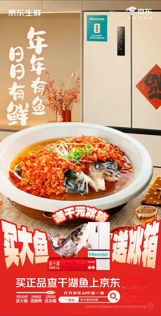 作为东北地域特色年货的代表,查干湖鱼走上全国消费者餐桌的背后,离不开京东生鲜超级供应链在源头包销等方面的持续探索。今年,京东生鲜以169万拍下查干湖“头鱼”送给幸运用户,与网友共享新年头彩,还包销近50%查干湖鱼,通过“一鱼一码”的溯源体系和五重锁鲜的高效冷链物流网络,实现查干湖鲜鱼最快次晨抵达全国核心城市。即便远在千里之外的广东,消费者下单后最快24小时就能收到新鲜的查干湖鱼,让南方消费者也能品尝到地道东北湖鲜风味。2月9日,上京东生鲜购买查干湖鱼,有机会获赠价值千元的冰箱,以及1元抢查干湖鱼惊喜福利。