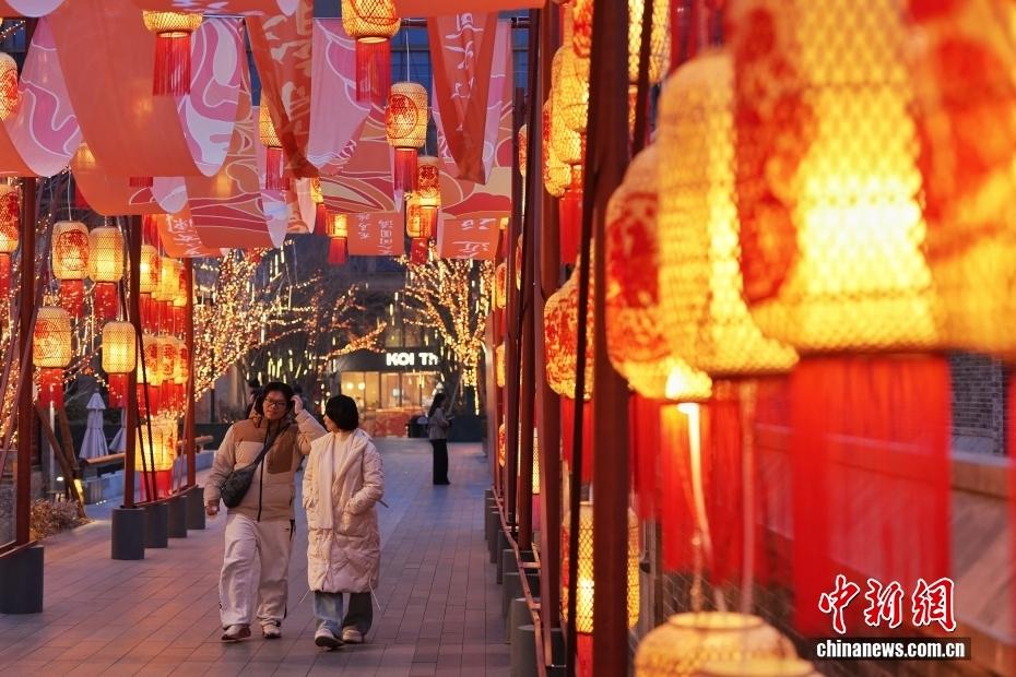 2月9日,市民经过北京中海大吉巷的灯笼长廊。春节临近,该商场打造多种春节景观,为市民寻年味提供去处。中新社记者 张祥毅 摄