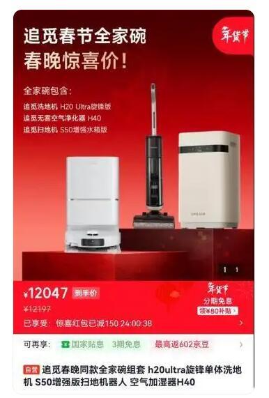 新春居家焕新的热潮中,智能家电成为了消费者的首选,而追觅此次携手京东带来的春晚同款全家碗智能家电套装,直接将焕新福利拉满——日常售价12197元的套装,在京东除夕“月黑风高”超级盛典中仅售2026元,直降超万元,这样的限定福利,让不少想要焕新居家家电的消费者直呼“太划算”。