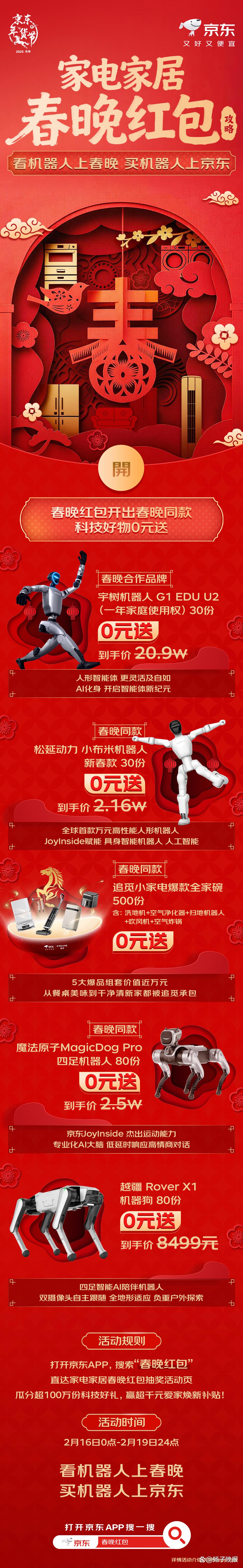值得一提的是,魔法原子、宇树科技、松延动力等春晚同款、春晚合作品牌机器人已全线入驻京东。京东数据显示,马年春晚还未结束,“春晚机器人”相关话题就登上了京东APP热搜。