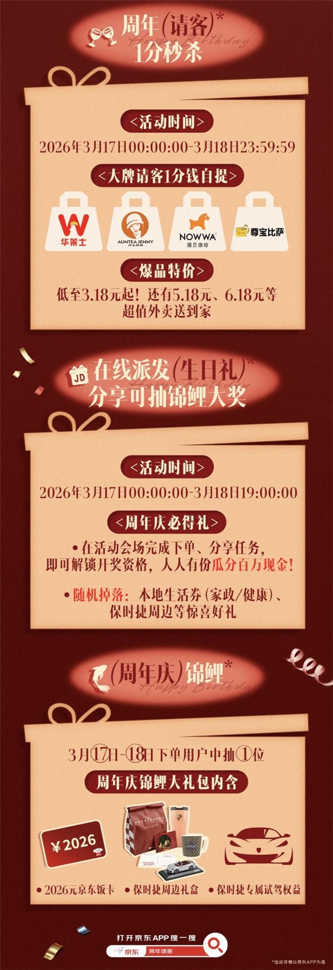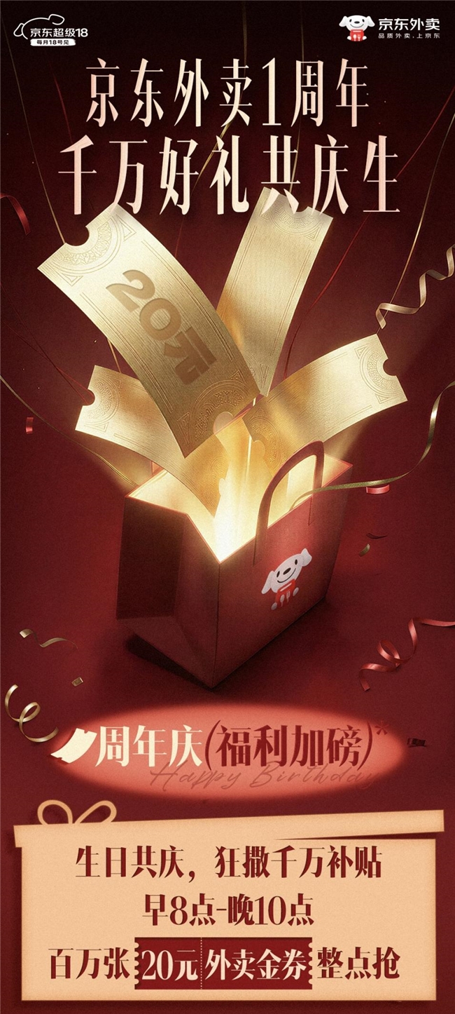 3月18日,京东外卖生日宴还在继续。打开京东APP“秒送”频道,搜索“周年请客”进入会场,外卖、自提尽享超值福利,一起共享这场狂欢盛宴。