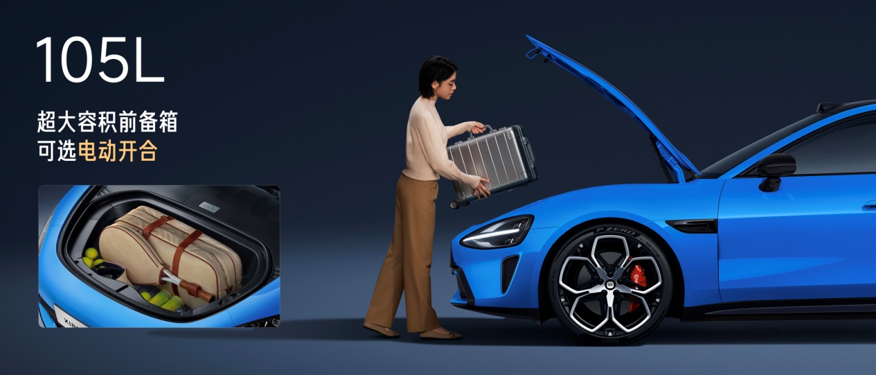 全系标配Ultra同款电动前备箱,支持8种开合方式,容积达105L,可容纳20英寸登机箱。开启方式包括车外实体按键、中控大屏、小米汽车APP、小米汽车APP小部件、遥控钥匙、UWB近场控车、车内小爱语音、车外小爱语音。