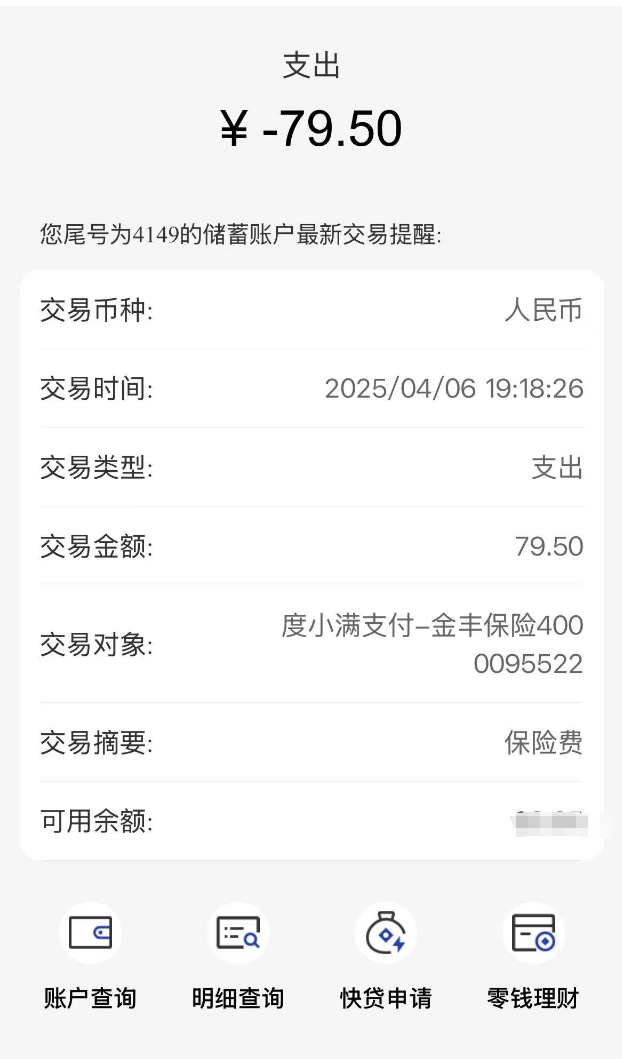 刘先生(化名)称,在银行app中发现被扣 180.9 元,扣款项目为保险费。其提供的截图显示,扣款时间为4月7日2时46分,收款账户为金丰保险,“交易地点/附言” 显示 “度小满支付 - 金丰保险4000095522”。刘先生表示从未用过度小满和金丰保险,也未注册相关账号,不清楚扣款缘由,要求对方尽快退款。