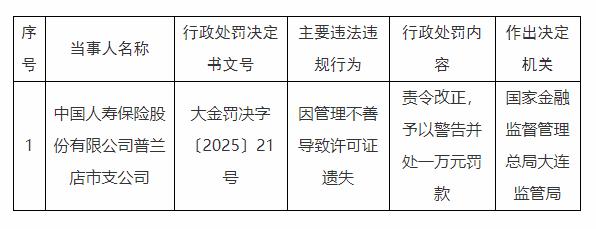 台海网6月18日讯 根据国家金融监督管理总局网站近日发布的行政处罚信息公开表(大金罚决字〔2025〕21号)显示,因管理不善导致许可证遗失,国家金融监督管理总局大连监管局对中国人寿保险股份有限公司普兰店市支公司责令改正,予以警告并处一万元罚款。