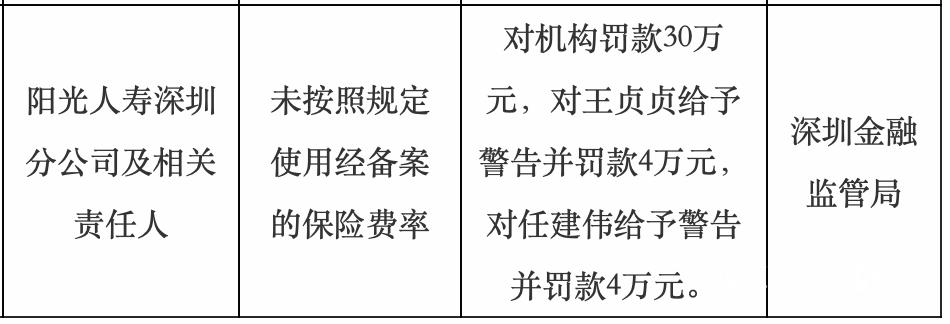 6月20日,国家金融监督管理总局深圳监管局行政处罚信息公示表显示,阳光人寿保险股份有限公司深圳分公司(下称“阳光人寿深圳分公司”)因未按照规定使用经备案的保险费率,被罚款30万元;相关责任人王贞贞、任建伟分别被给予警告并罚款4万元。
