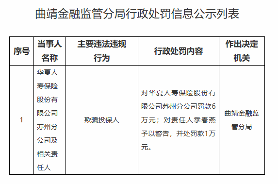 中国经济网北京7月31日讯 国家金融监督管理总局网站近日发布的曲靖金融监管分局行政处罚信息公示列表显示,华夏人寿保险股份有限公司苏州分公司及相关责任人存在以下违法违规行为:欺骗投保人。曲靖金融监管分局对华夏人寿保险股份有限公司苏州分公司罚款6万元;对责任人季春燕予以警告,并处罚款1万元。