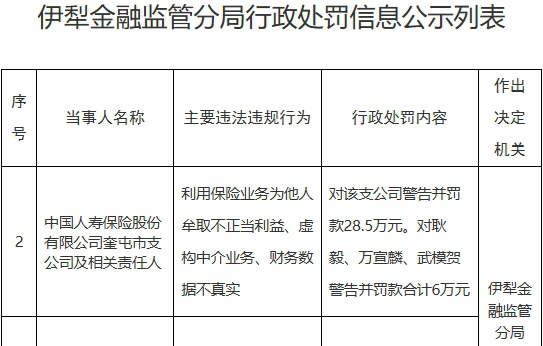 伊犁金融监管分局对该支公司警告并罚款28.5万元;对耿毅、万宣麟、武模贺警告并罚款合计6万元。