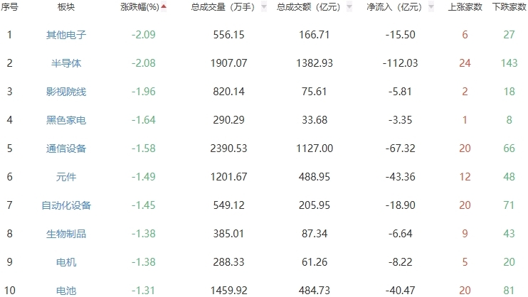 板块方面,保险、饮料制造、零售等板块涨幅居前,其他电子、半导体、影视院线等板块跌幅居前。
