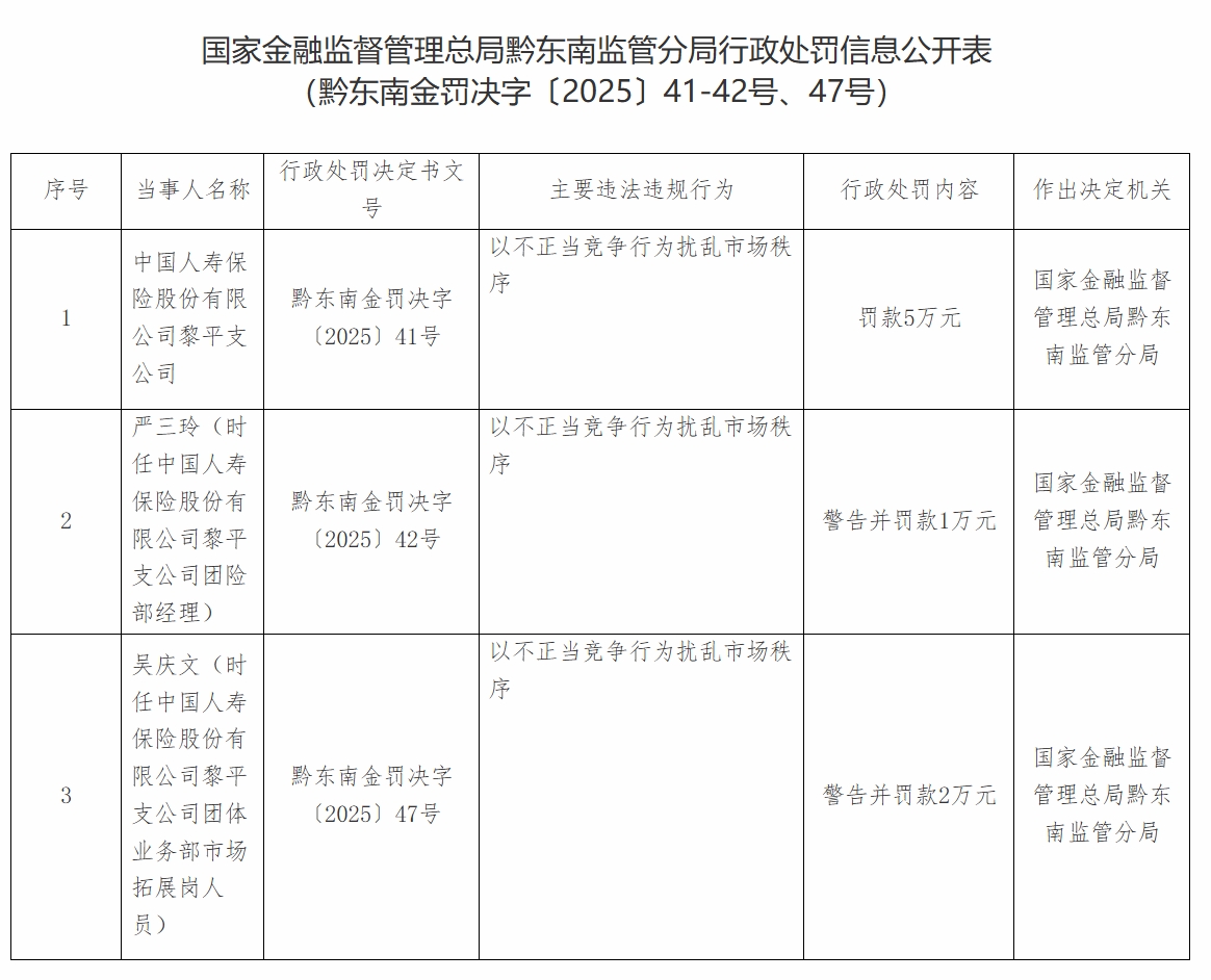 根据行政处罚决定书,中国人寿保险股份有限公司黎平支公司存在以不正当竞争行为扰乱市场秩序的违法事实,具体违规行为细节并未披露。针对上述违法行为,国家金融监督管理总局黔东南监管分局依法对中国人寿黎平支公司处以5万元罚款。同时,对严三玲给予警告并罚款1万元,对吴庆文给予警告并罚款2万元。(信网记者)