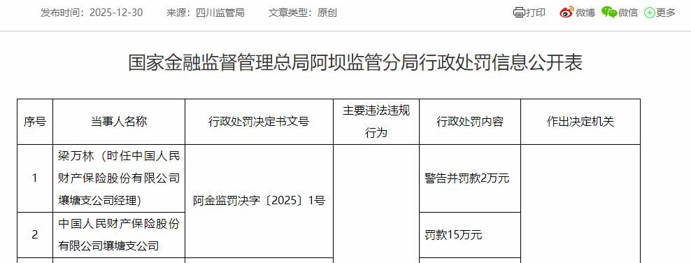 国家金融监督管理总局阿坝监管分局对中国人民财产保险股份有限公司壤塘支公司罚款15万元,梁万林(时任中国人民财产保险股份有限公司壤塘支公司经理)警告并罚款2万元。