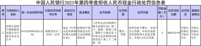中国经济网北京1月23日讯 中国人民银行网站昨日公布2025年第四季度拒收人民币现金行政处罚情况。中国人民财产保险股份有限公司宁波市北仑支公司(以下简称“人保财险宁波市北仑支公司”)拒绝客户使用现金支付方式办理投保业务。