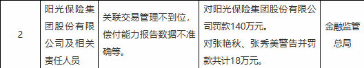 行政处罚决定书显示,阳光保险集团股份有限公司及相关责任人员因关联交易管理不到位,偿付能力报告数据不准确等,国家金融监管总局对阳光保险集团股份有限公司罚款140万元。