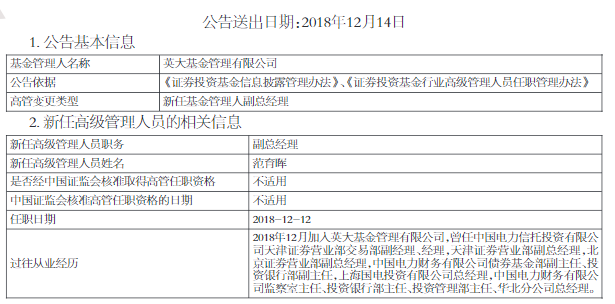新浪财经讯 12月14日消息,英大基金发布高级管理人员变更的公告,新任范育晖为公司副总经理,变更日期为12月12日。