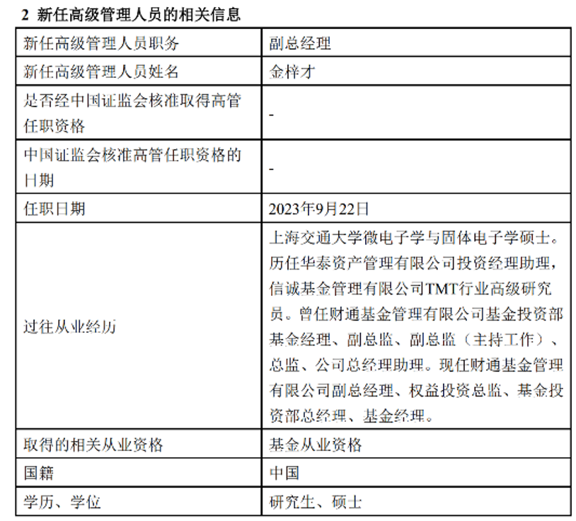 9月22日晚,财通基金最新公告显示,金梓才担任公司副总经理一职。