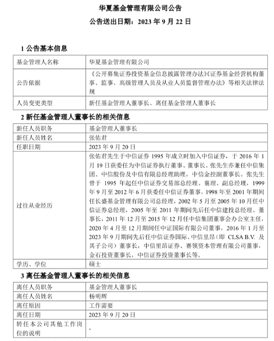 公告显示,张佑君自9月20日起担任华夏基金董事长职务,原董事长杨明辉因工作需要离任。在公告中,华夏基金对杨明辉担任董事长期间为公司发展所做出的重要贡献表示了衷心感谢。