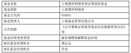 中国经济网北京12月4日讯 近日,上银基金管理有限公司公告,上银慧祥利债券增聘基金经理葛沁沁,许佳离任。