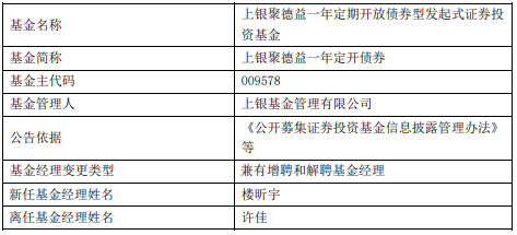 上银聚德益一年定开债券增聘基金经理楼昕宇