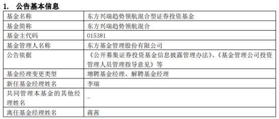 东方兴瑞趋势领航混合增聘基金经理李瑞 蒋茜离任
