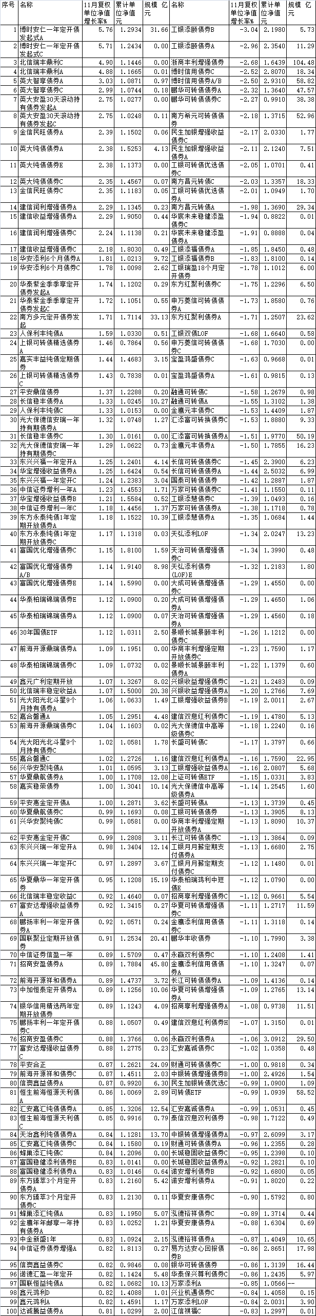 与A股相关的转债、增强收益型债券基金在11月业绩落后,但多数跌幅都在3%以内。如浙商丰利增强债券在11月就下跌了2.68%,其三季度前五大持仓债券为G三峡EB1、大秦转债、杭银转债、南银转债、23国债10。民生加银增强收益债券C、民生加银增强收益债券A跌幅为2.17%、2.11%,三季度重仓债券包括中金转债、敖东转债、22国债、21南航、21外运01。