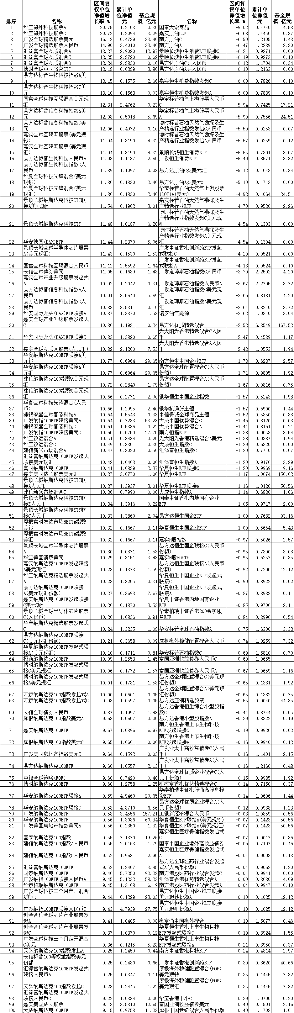 2023年11月份QDII基金涨跌幅前100名