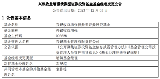 中国经济网北京12月5日讯 今日,兴银基金管理有限责任公司公告称,兴银收益增强(A类003628;C类018500)增聘基金经理邓纪超。