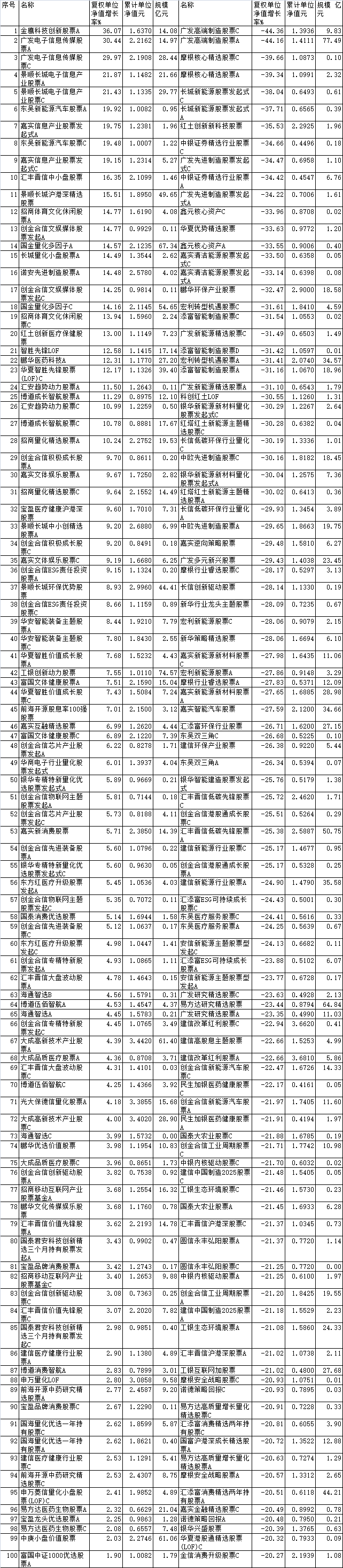 2023年前11月普通股票型基金涨跌幅前100名