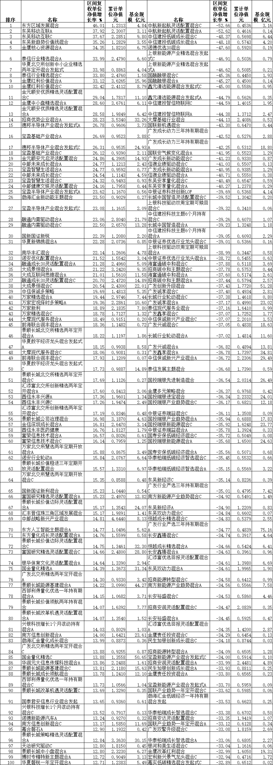 跌幅榜上,今年前11月共计24只混基下跌超过40%。其中,中航新起航灵活配置混合C、中航新起航灵活配置混合A分别以-52.66%、-52.62%的收益率垫底。这2只基金成立于2018年4月23日,截至2023年12月4日,其成立来收益率为-55.43%、-54.64%,累计净值为0.4457元、0.4536元。