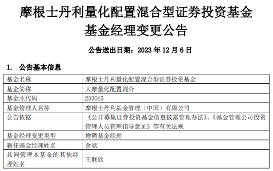 中国经济网北京12月6日讯 今日,摩根士丹利基金管理(中国)有限公司公告称,大摩量化配置混合(A类233015;C类008305)增聘基金经理余斌。