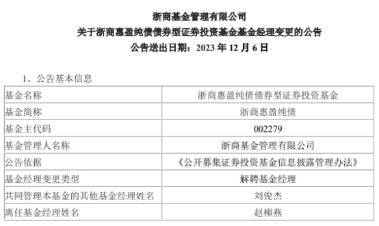中国经济网北京12月6日讯 今日,浙商基金管理有限公司公告称,赵柳燕离任浙商惠盈纯债(A类002279;C类008548)。