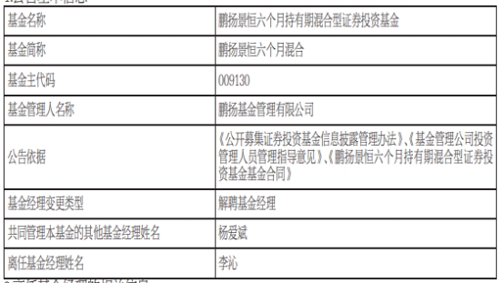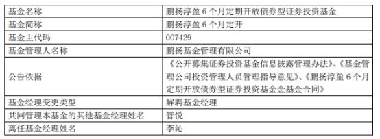 中国经济网北京1月19日讯 鹏扬基金管理有限公司今日公告称,基金经理李沁离任鹏扬淳盈6个月定开债(A类007429;C类007430;D类019477)、鹏扬景恒六个月持有混合(A类009130;C类009131)。