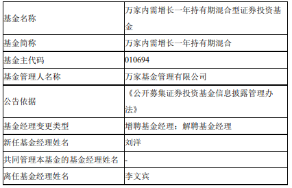 李文宾离任万家内需增长一年持有期混合 刘洋管理