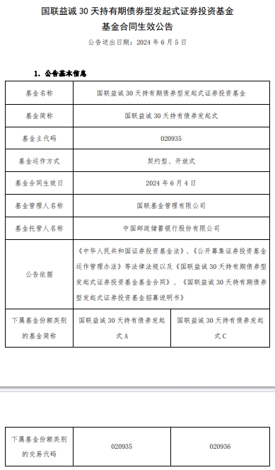 中国经济网北京6月5日讯 今日,国联基金管理有限公司发布国联益诚30天持有期债券型发起式证券投资基金基金合同生效公告。