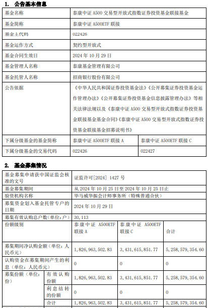 泰康中证A500ETF联接成立 规模52.59亿元