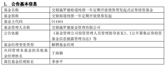 中国经济网北京1月15日讯 今日,交银施罗德基金管理有限公司公告称,季参平离任交银裕道纯债一年定期开放债券发起(014464)。