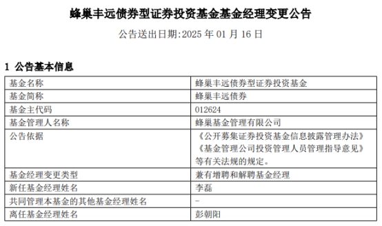 中国经济网北京1月16日讯 今日,蜂巢基金管理有限公司公告称,蜂巢丰远债券(A类012624;C类012625)增聘基金经理李磊,彭朝阳离任。