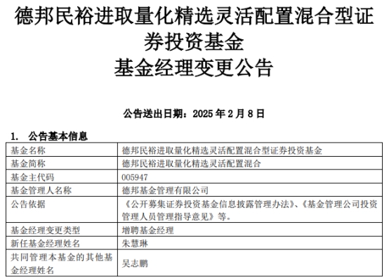 中国经济网北京2月10日讯 近日,德邦基金管理有限公司公告称,德邦民裕进取量化精选灵活配置混合(A类005947;C类005948)增聘基金经理朱慧琳。