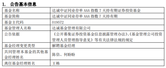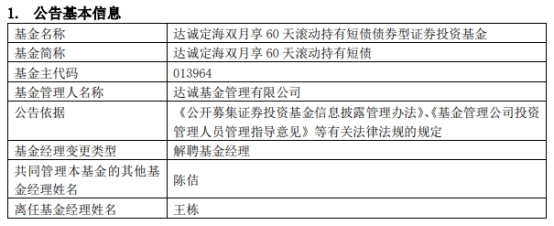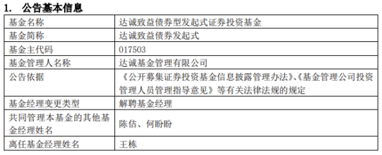 达诚基金王栋离任4只基金