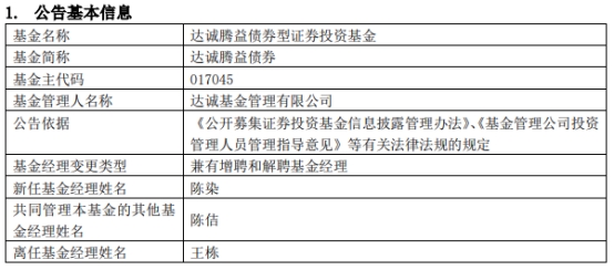 达诚腾益债券增聘基金经理陈染。陈染曾任广发银行战略客户部客户经理、广发银行资产管理部投资经理;广银理财有限责任公司集中交易部交易员;达诚基金管理有限公司研究部研究员。现任达诚基金管理有限公司基金经理。