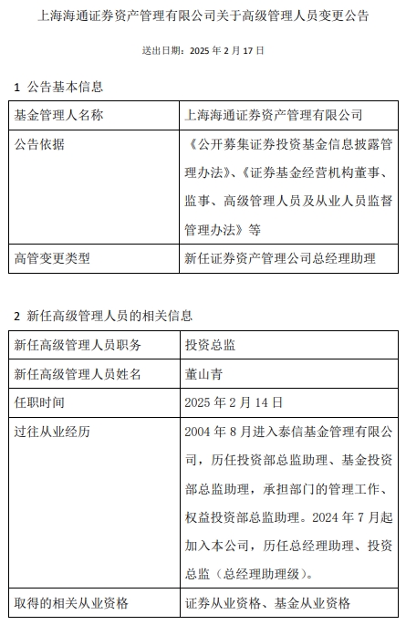 公告显示,董山青2004年8月进入泰信基金管理有限公司,历任投资部总监助理、基金投资部总监助理,承担部门的管理工作、权益投资部总监助理。2024年7月起加入本公司,历任总经理助理、投资总监(总经理助理级)。