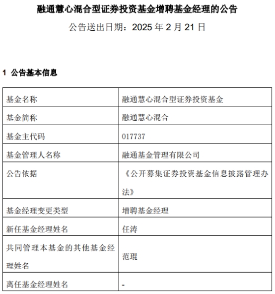 中国经济网北京2月21日讯 今日,融通基金管理有限公司公告称,融通慧心混合(A类017737;C类017738)增聘基金经理任涛。